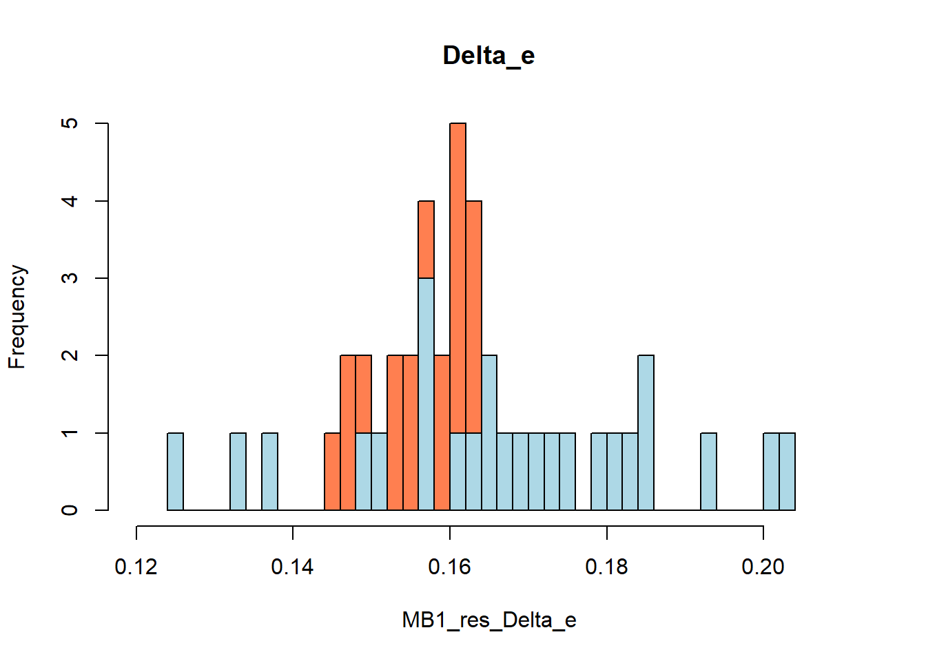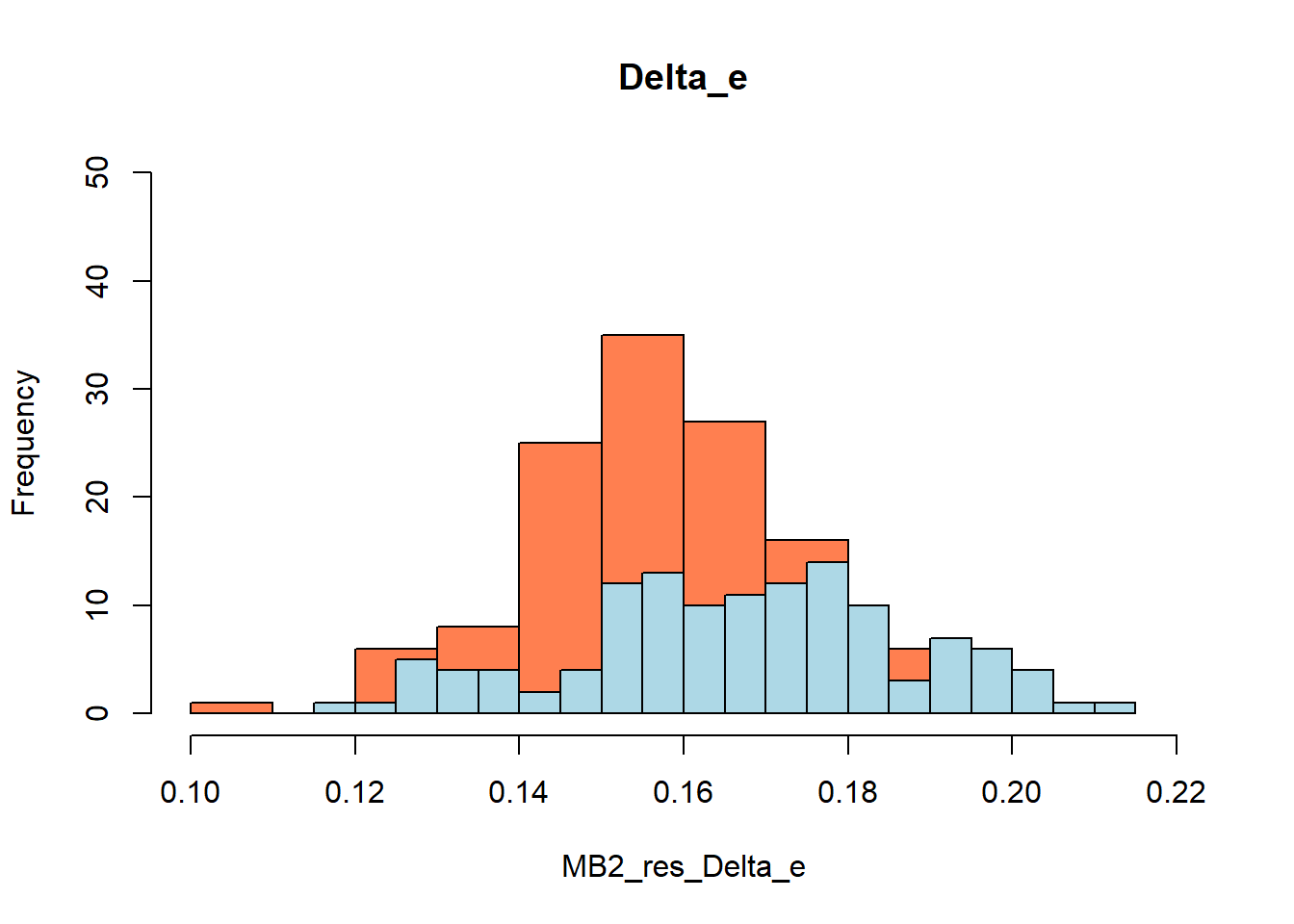 Finally, we can quickly compare the generated incremental quantities \(\Delta_e\) distributions under each strategy and aggregation approach, for example using histograms. First, we consider using the averaged \(B\) estimates across the \(M\) imputations under either MB (red) or BM (blue).