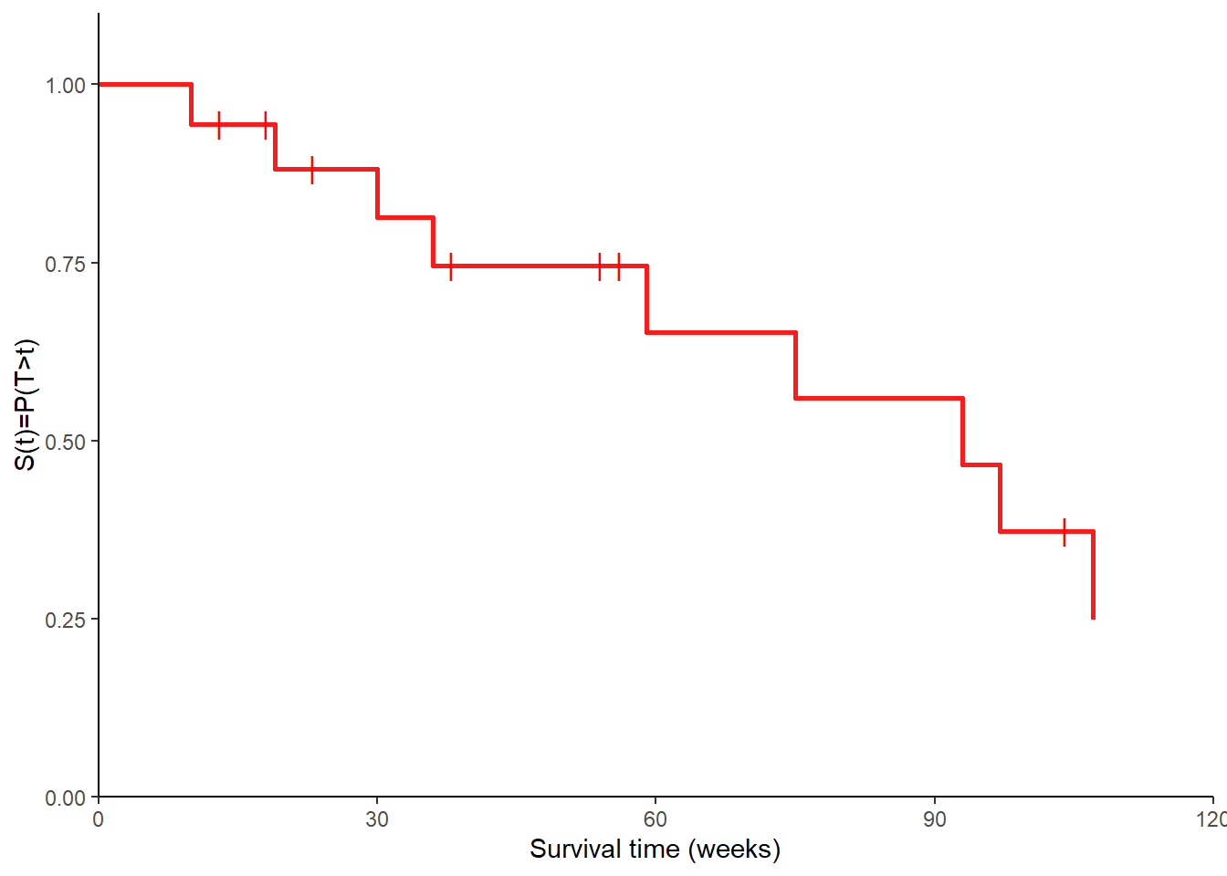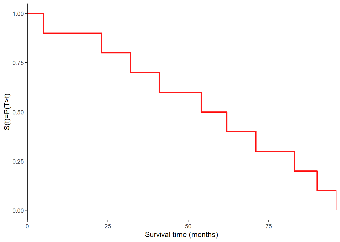 \[ S(t) = P(T>t)=1-F(t), \] where \(T\) denotes the survival time (i.e. time to the event) random variable with probability density function \(f(t)\) and cumulative distribution function \(F(t)\). The survival function \(S(t)\) measures the probability that a subject experiences the event beyond time \(t\). If no subject is censored, we could use the following empirical estimate of the function at each time \(t\):