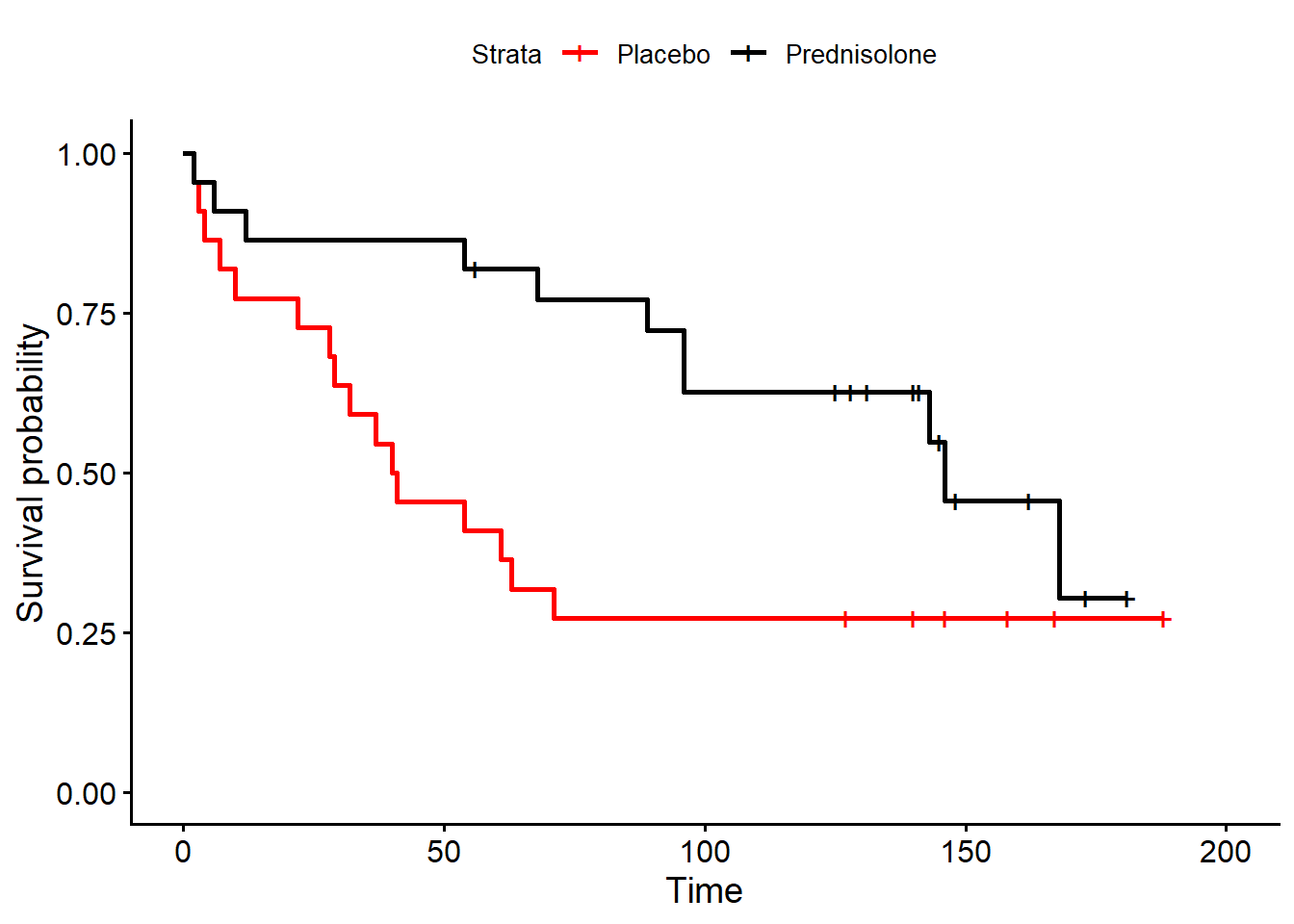 Kirk et al. (1980) reported findings from a trial of prednisolone in \(44\) patients with chronic active hepatitis, randomised to either receiving prednisolone (\(n=22\)) or placebo (\(n=22\)), with the outcome of interest being survival time (time until death). The survival times (in months) of the two groups of patients are given below, with associated censoring times.