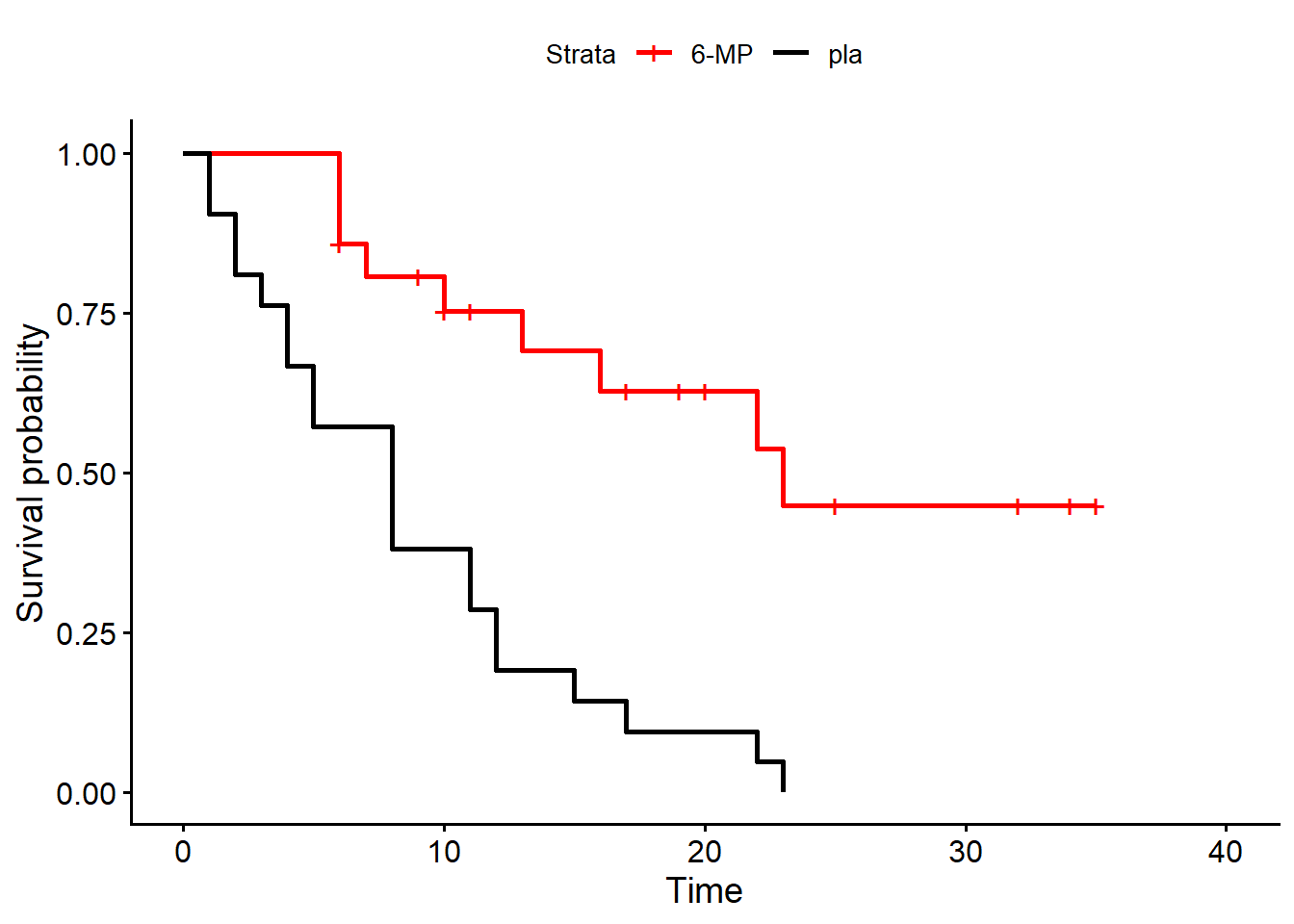 ggsurvplot(km_fit3, data = df_ex3, palette = c("red", "black"), legend.labs = c("6-MP",